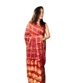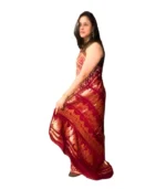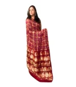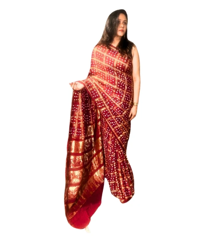 Maroon Coloured Semi Crepe Bandage Printed Saree Adorned with Zari Weaving, Paired With an Unstitched Blouse Piece with Bandage Print In Sleeves. This Embroidered Saree Ensemble Embodies Timeless Elegance and Showcases Intricate Craftsmanship by Smitas Fashion Studio, Making It Perfect for Weddings and Other Grand Occasions. A Sophisticated Choice for Those Who Seek Exclusivity.